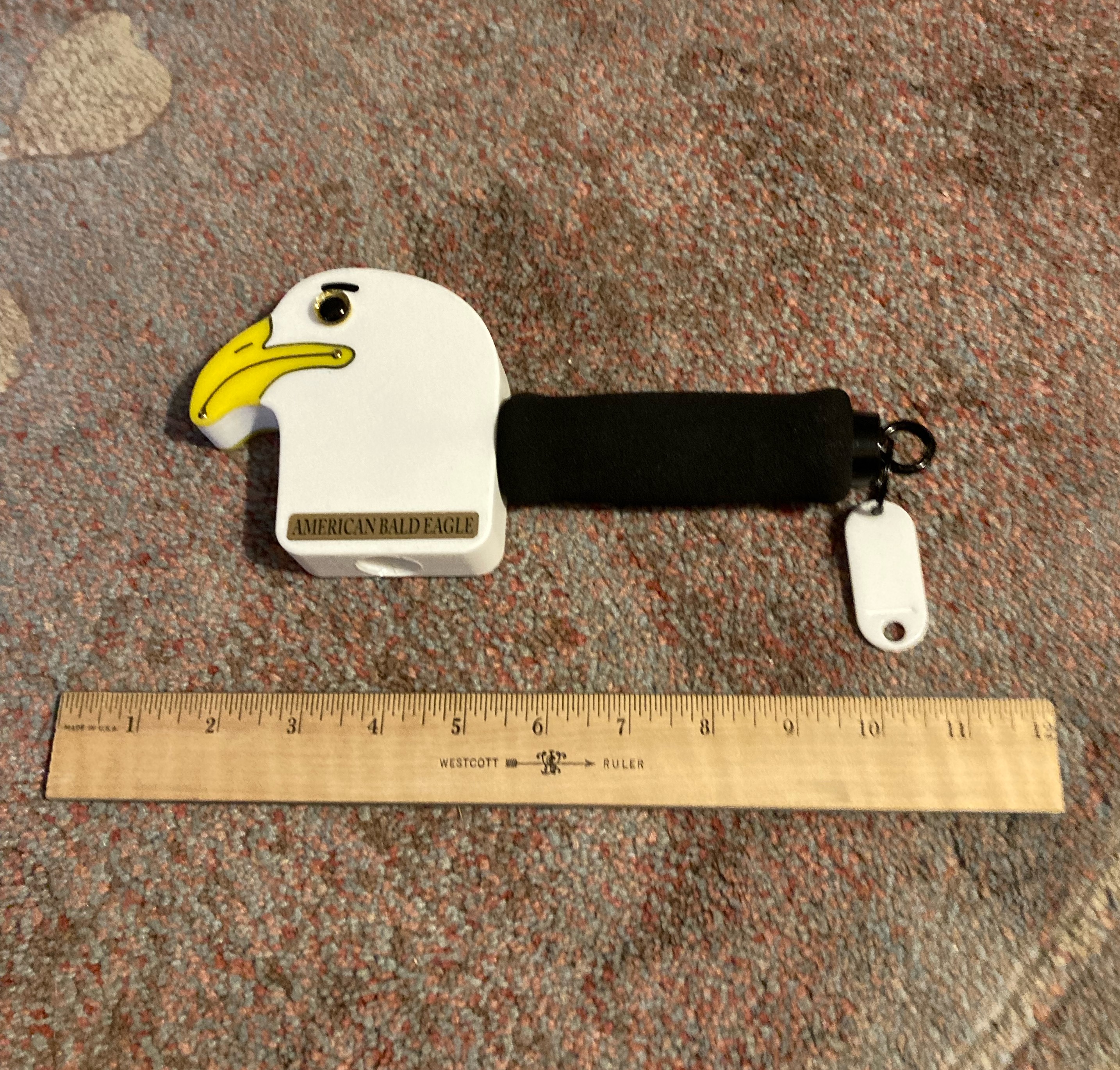 A walking cane with a caricature American Bald Eagle head handle made in the USA.